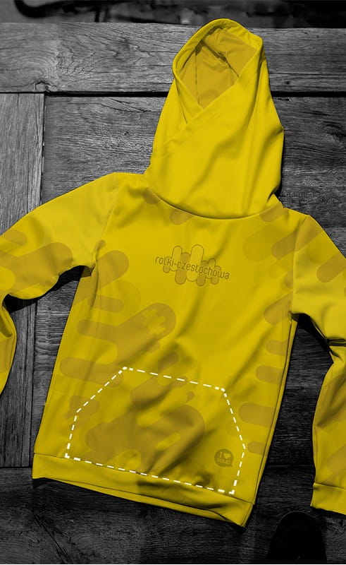 Bluza sportowa z materiału hydrofobowego - z zamkiem, kapturem i kieszonkami. Nadrukowana sublimacyjnie na całej powierzchni.