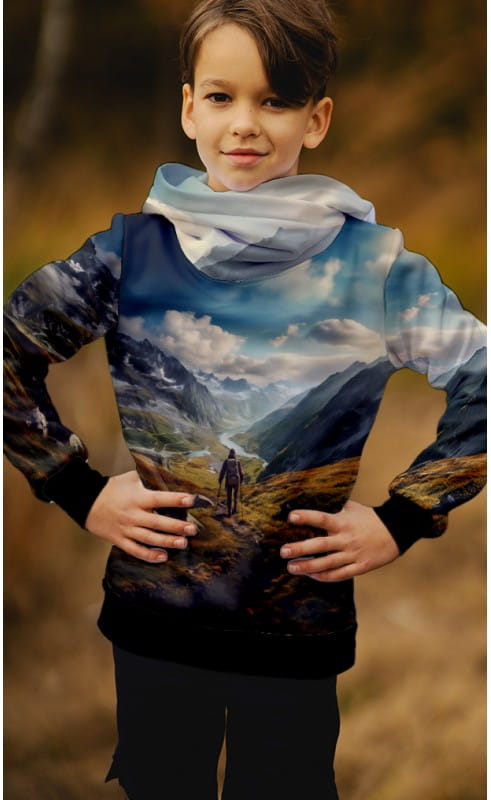 Bluza sportowa z nadrukiem w góry, z wygodnego, ciepłego i zapewniającego komfort cieplny materiału o właściwościach hydrofobowych (nie nasiąka wodą pozwalając jej swobodnie spływać po powierzchni bluzy).