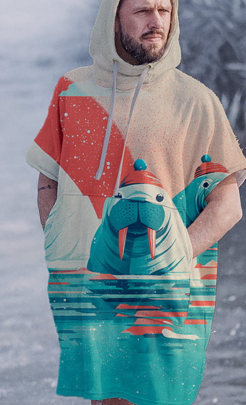 Ponczo do morsowania a uniwersalnym rozmiarze. Uszyliśmy je z microfibry o gramaturze 430g. Długo takiej szukaliśmy! Chcieliśmy, aby była grubsza niż większość dostępnych na rynku cienkich reczniczków. Bo to przecież ponczo! I to z kieszenią!